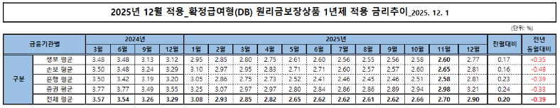 1. 25년 12월 적용되는 DB형 퇴직연금 원리금보장상품 금리는 시장금리 상승영향으로 전월대비 전체적으로 큰폭 상승세를 보임.